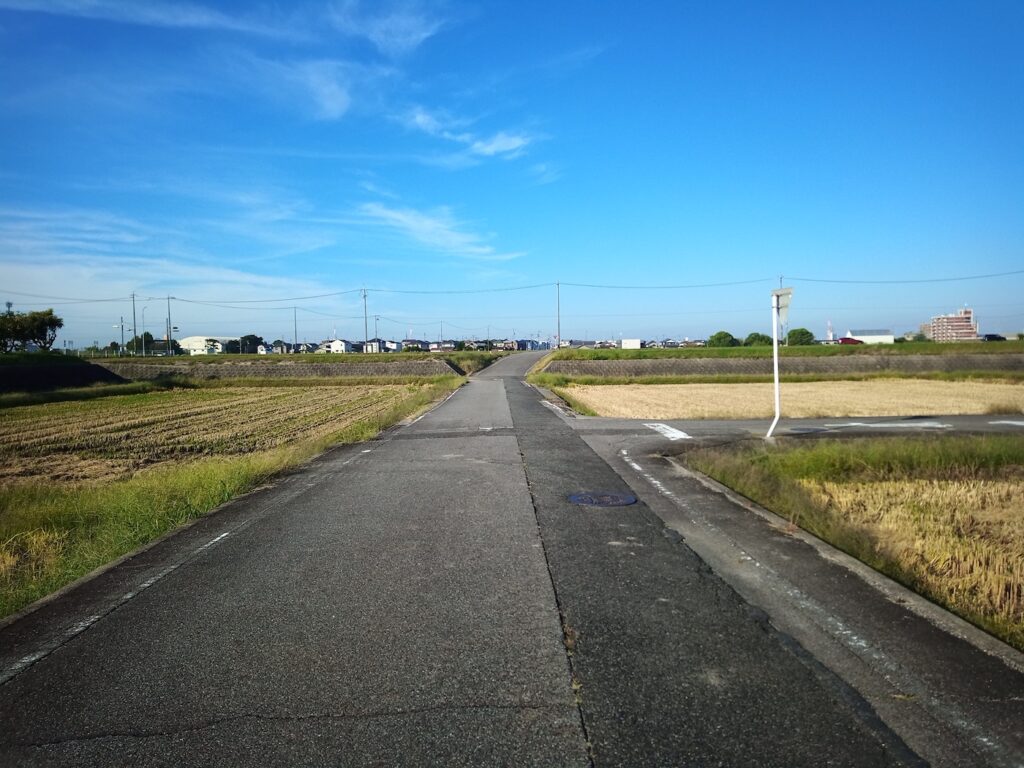 何気ない田んぼの中を通過する道ですが、よくみると途中から少し上り坂になっているのがわかります。