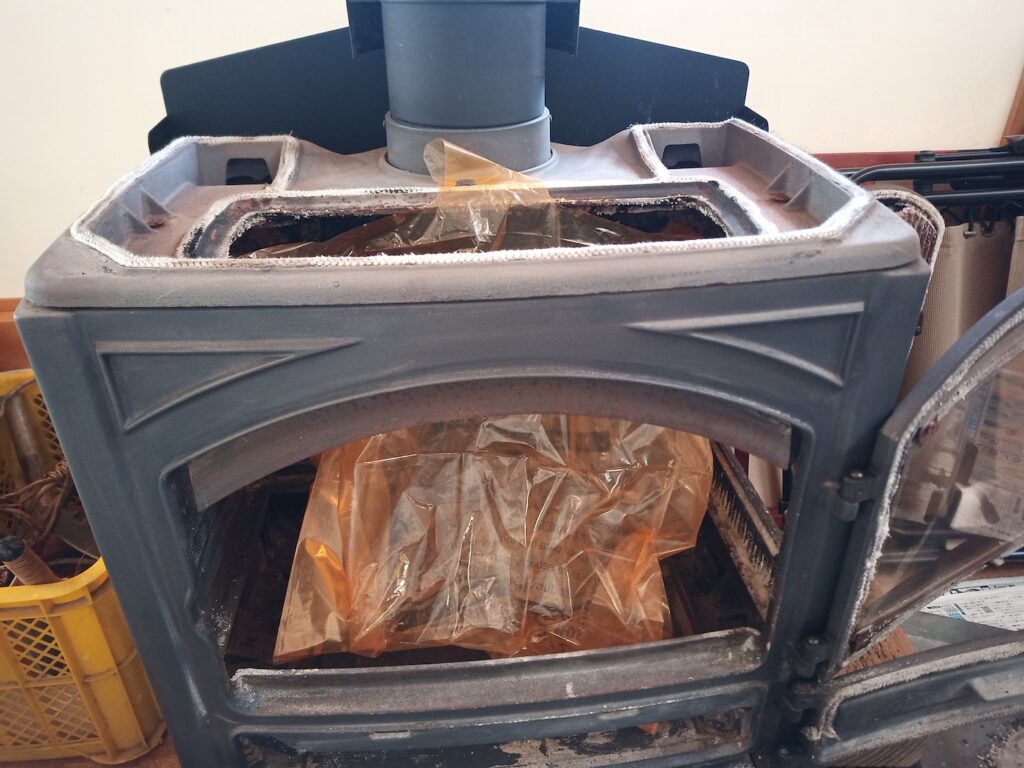 が、その前に本体と煙突の接続部にゴミ袋を設置しておきます。