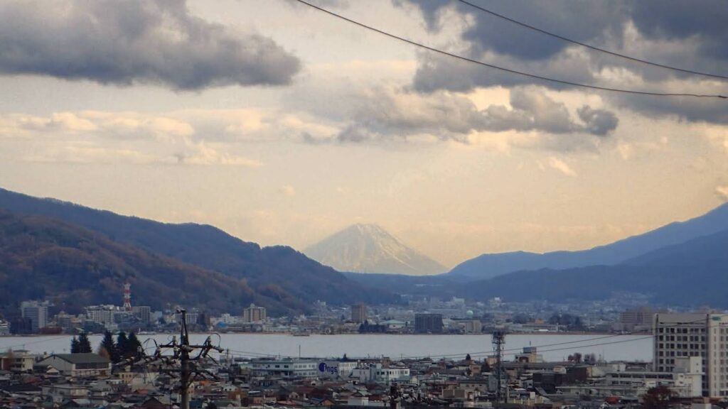 遠目にチラッと見える程度ですが、中腹付近まで雪がしっかりと積もっています。