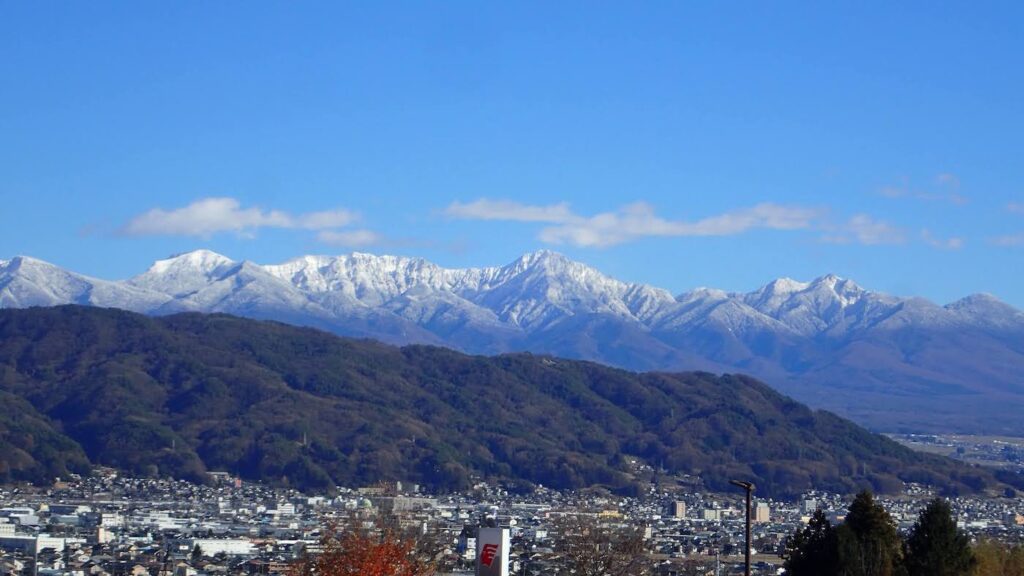 一夜明けた後の近くの山々にもうっすらと雪に覆われていました。