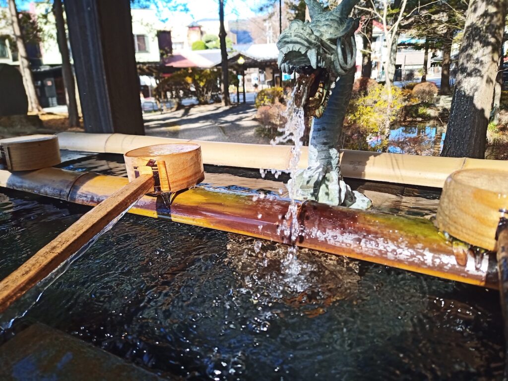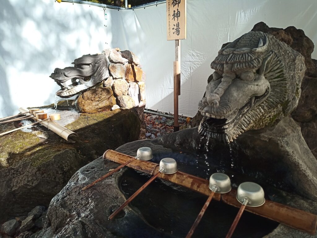 前日の冷え込みで手洗い場の柄杓が凍りついていました。