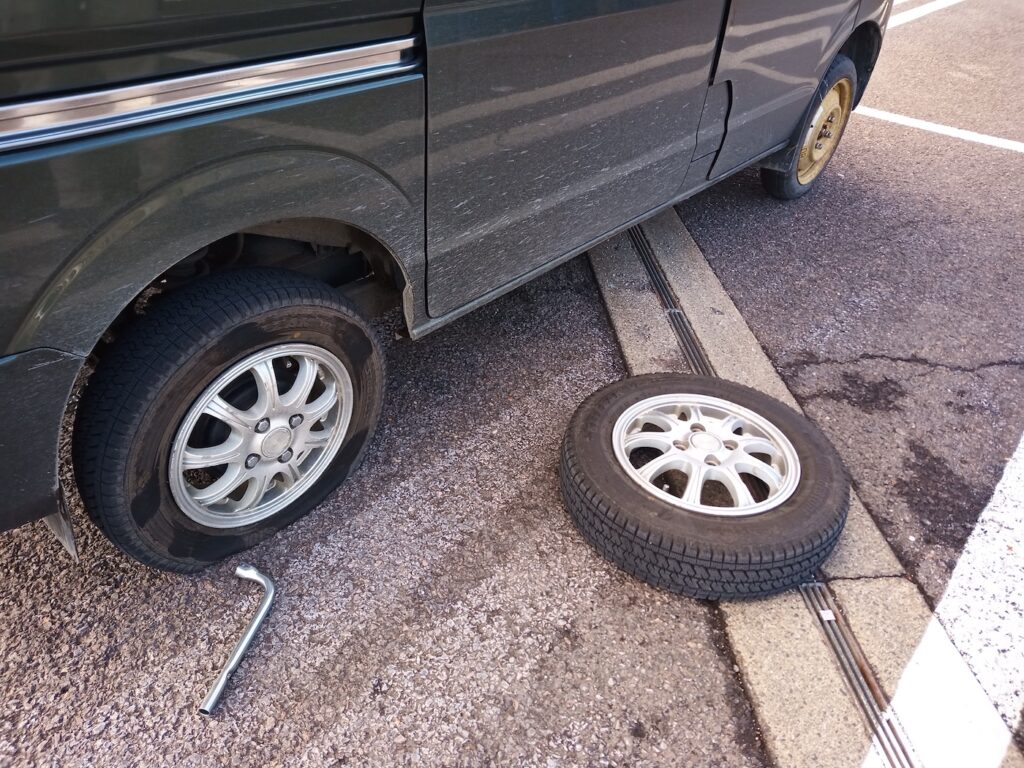 まずは、右前のタイヤにスペアタイヤを装着します。