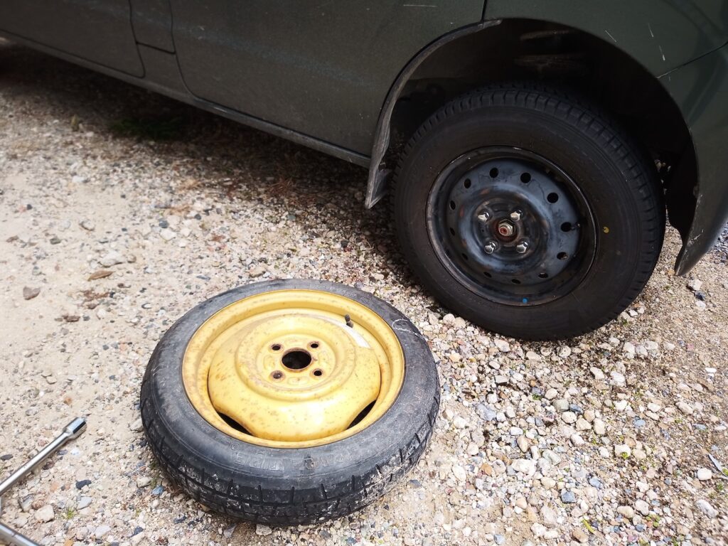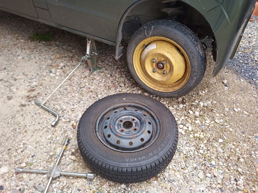 このまま純正のスペアタイヤの状態では、来週からの現場に対応できないので、予備のタイヤに交換しておきます。