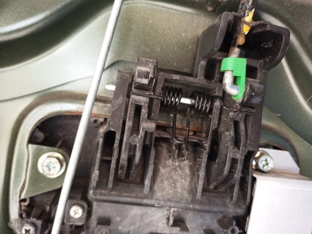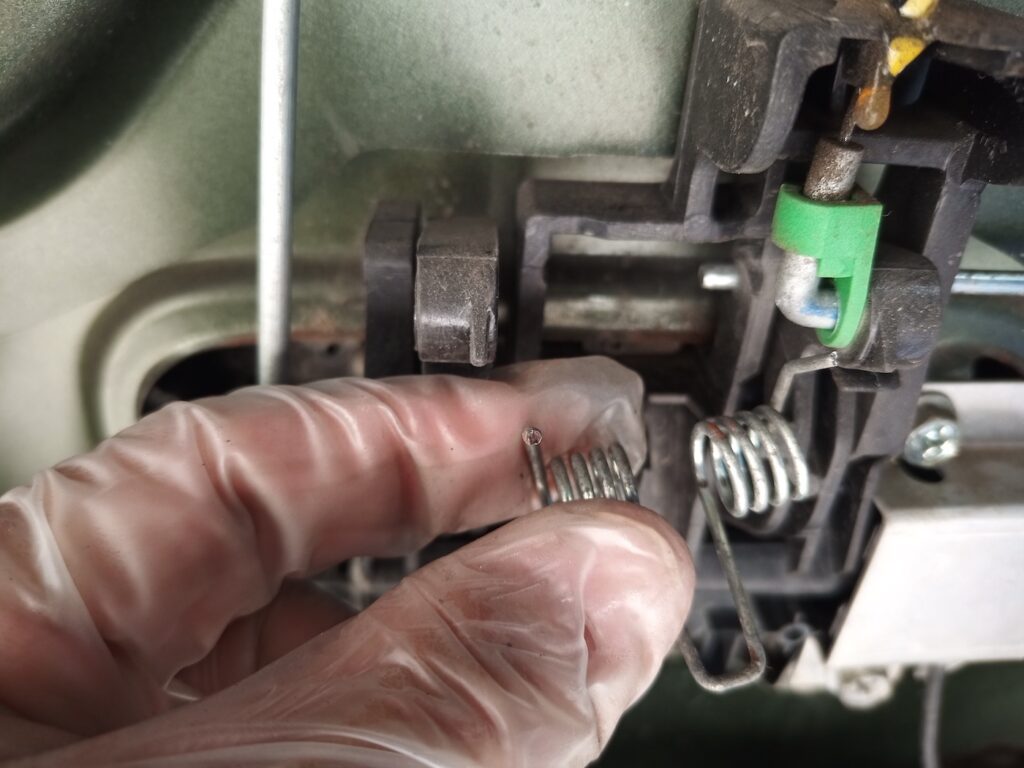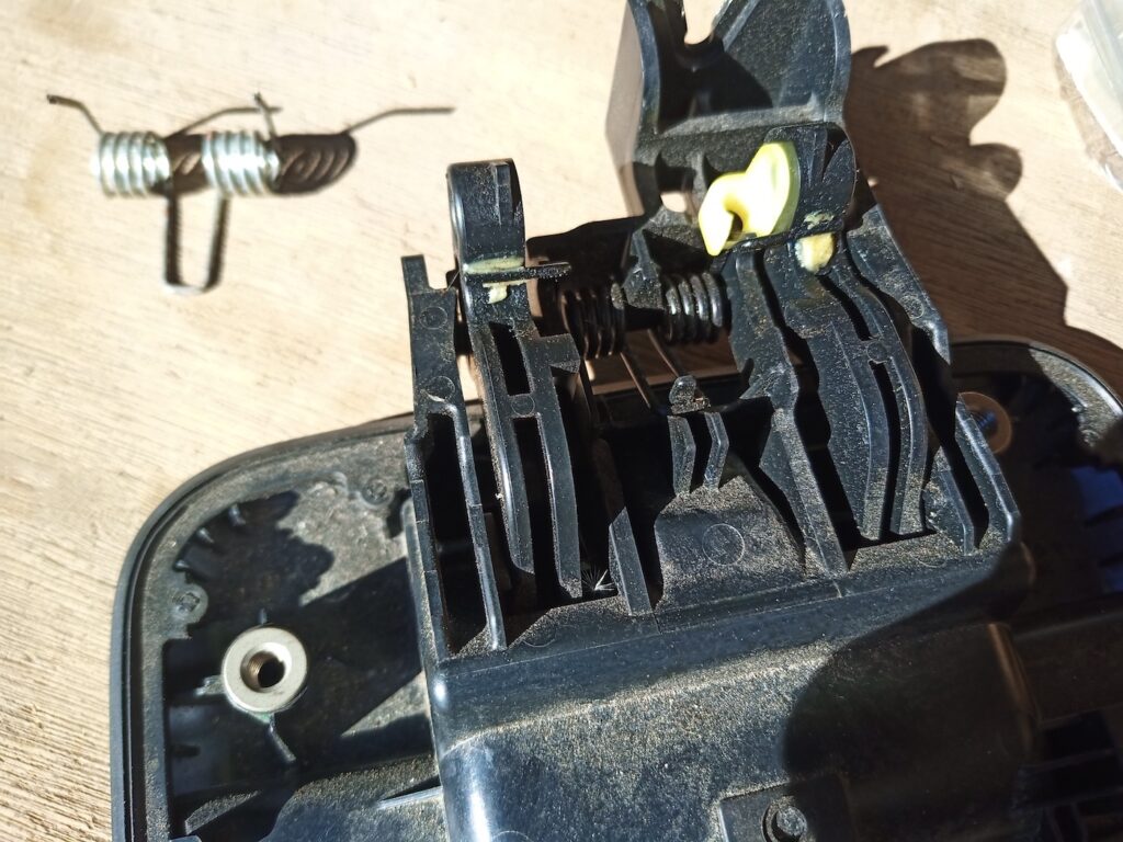取り外した純正のドアハンドルからバネを引っ張り出して交換します。