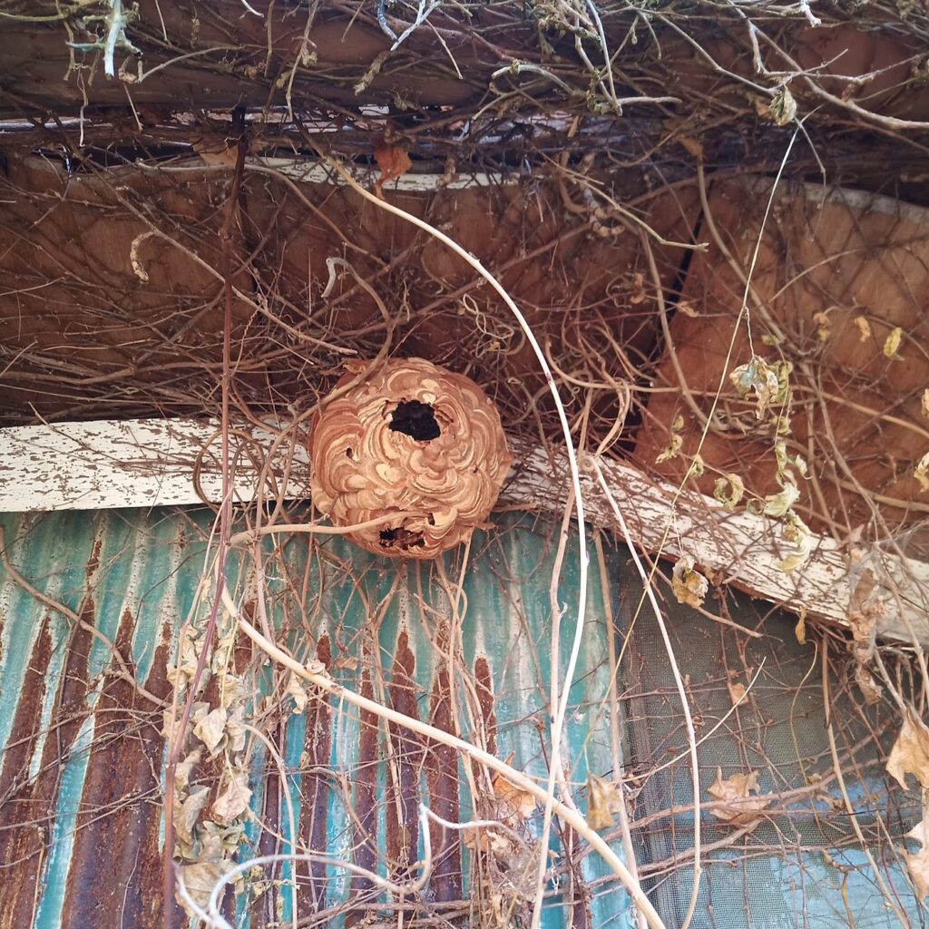 年末の家の周りの片付けをしていたところ、裏の廃屋の屋根下にスズメバチの巣がありました。