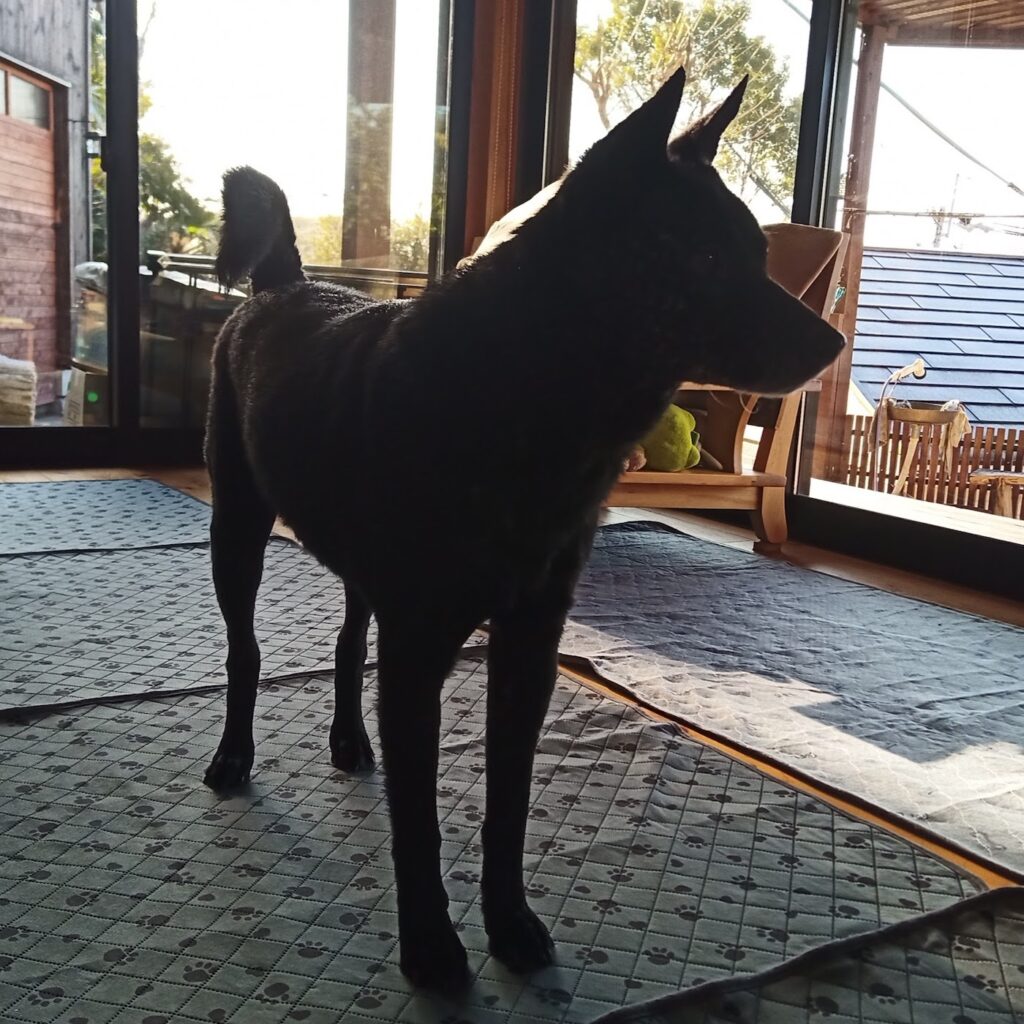 シャンプーの終わった後は、薪ストーブの前でのんびりと乾かします。