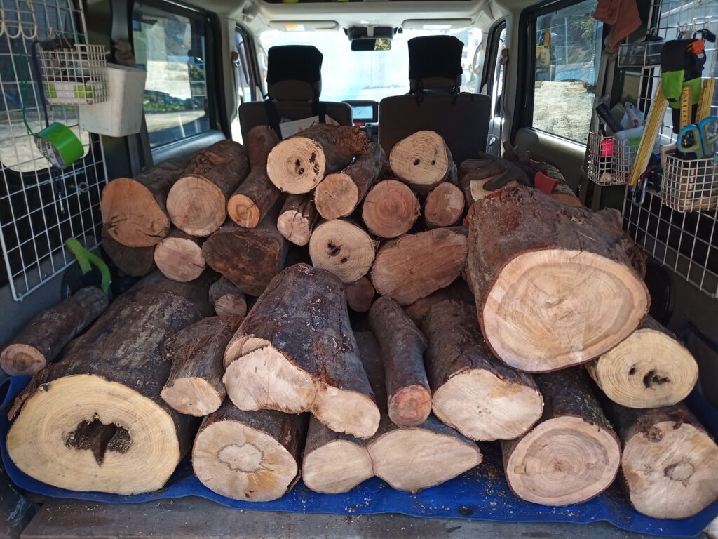 現地で玉切りして車に積み込んで運びます。