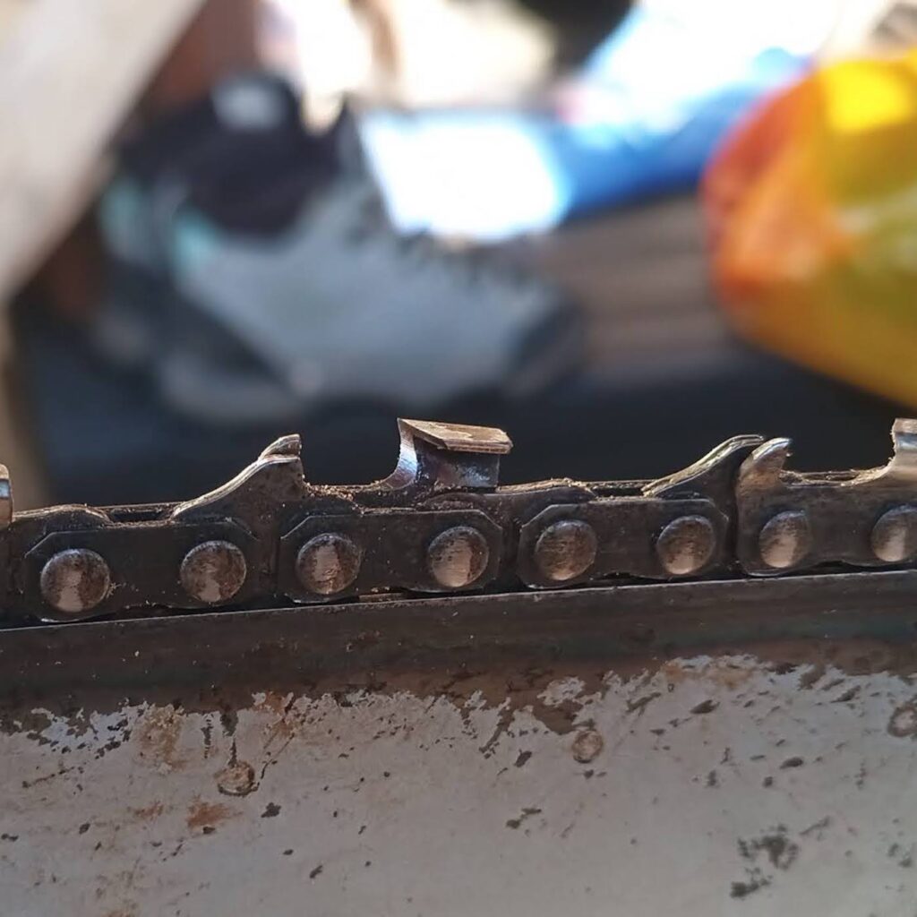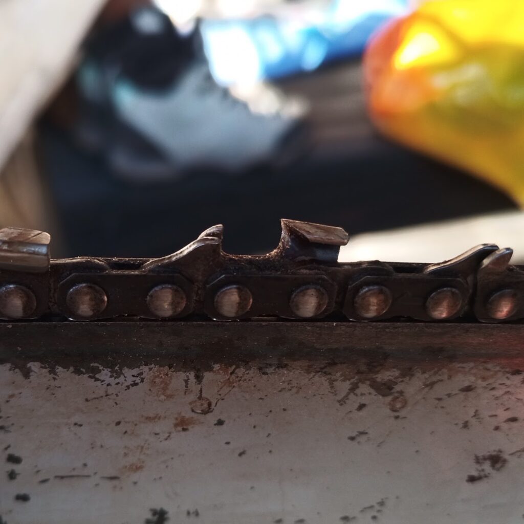 玉切り後のチェーンソーの刃は、こんな感じで汚れています。