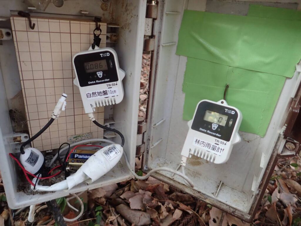 森の中で土壌水分を観測しています。