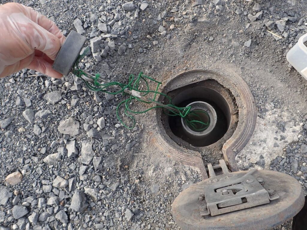 観測孔の中には、センサーがワイヤーで吊り下げられています。