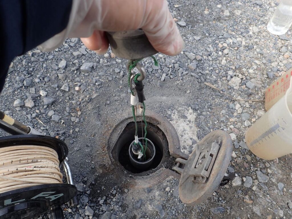 現場で地下水を観測しています。