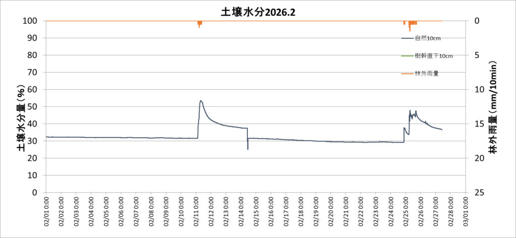 降雨により一時的に土壌水分が上昇していることがわかります。