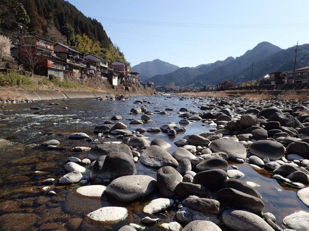 いつも現場で通っている川の玉石にも水位が下がっている痕跡が残されています。